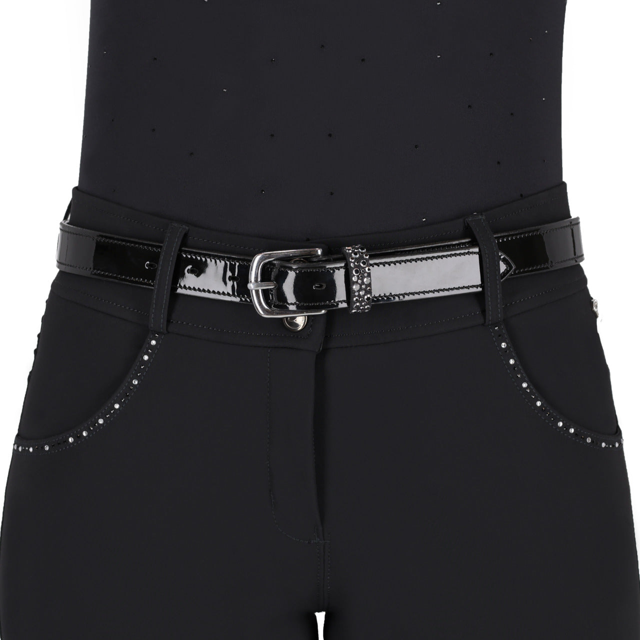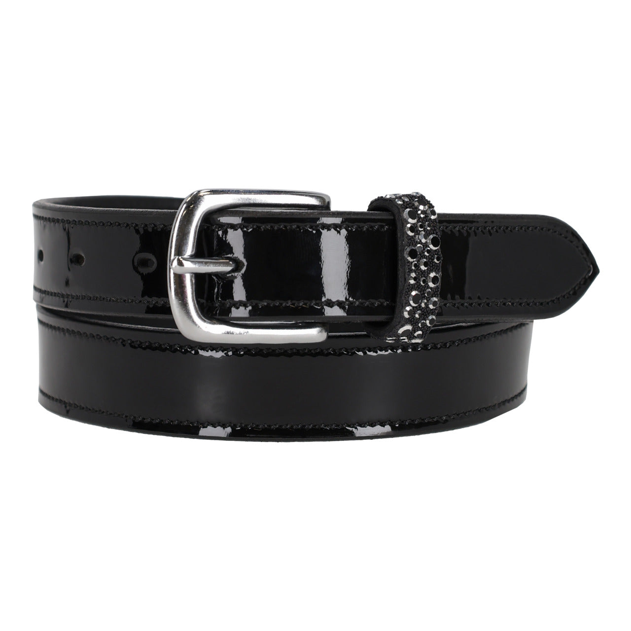 Der Gürtel Lagos besteht aus Lackleder mit silberner Edelstahlschnalle. Die feste Gürtelschlaufe ist mit unterschiedlich großen Strasssteinchen besetzt.